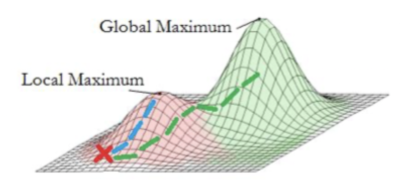 analogous to climbing hill by always moving to next highest point - can get caught in local maxima