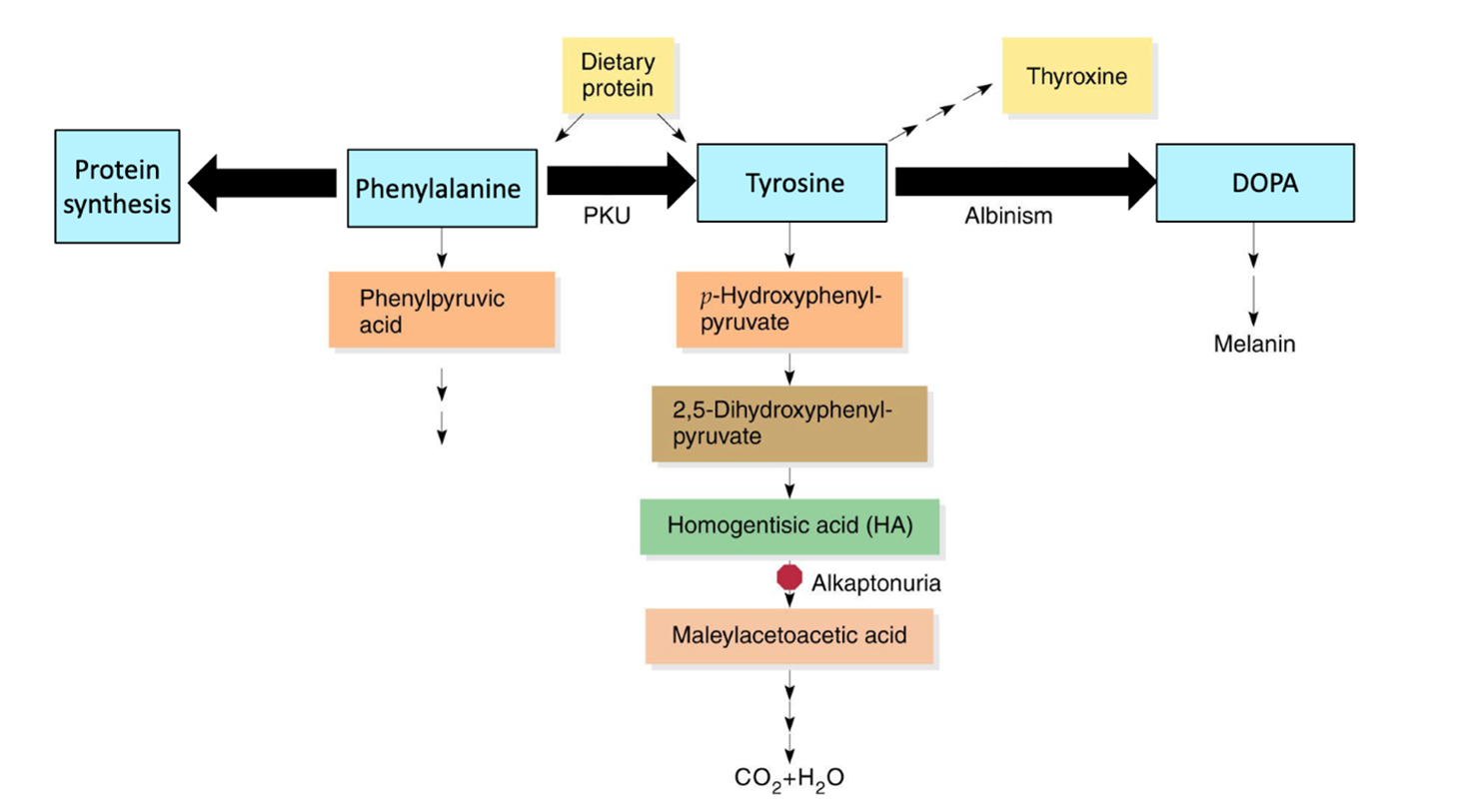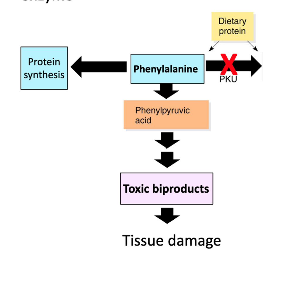 •Lack of enzyme = Accumulation of phenylalanine in tissues and brain
