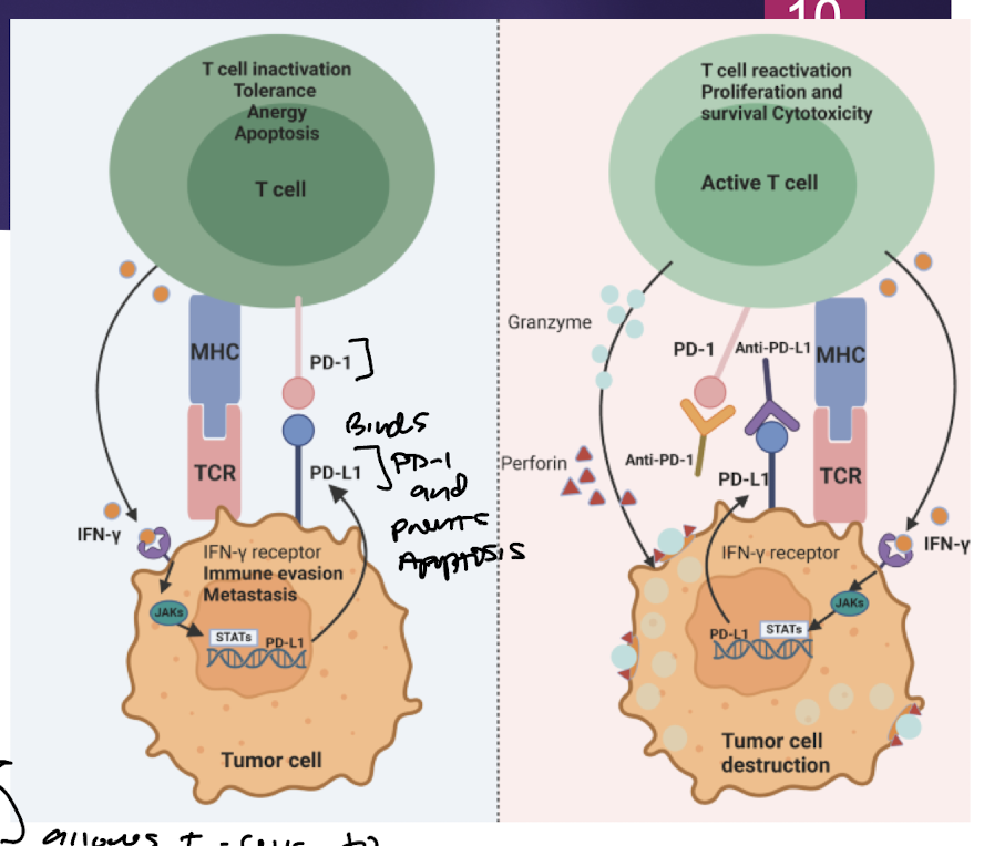 PD-1 Targeted mAb → block T-cell’s PD-1 from being bound and inactivated by PD-L1 on tumor cell