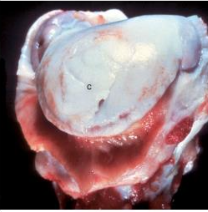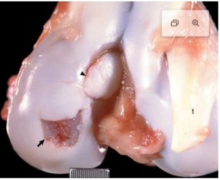 clefts in the necrotic cartilage with subsequent fracture of the overlying articular cartilage → some degree of separation from underlying bone → cartilaginous or osteochondral flap (chip or joint mouse) → interfere with movement of joint, pain, joint effusion