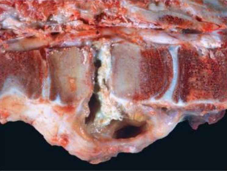 What is affecting this bovine vertebrae? note the yellow white exudate and the sclerotic bone surrounding the exudate.