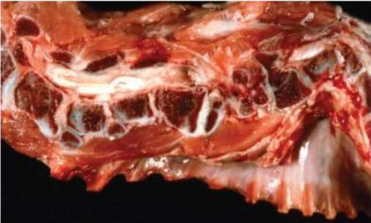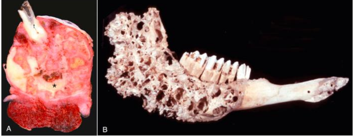What was affecting this bovine jaw? note the nodules of tan, pyogranulomatous inflammation and porous bone.