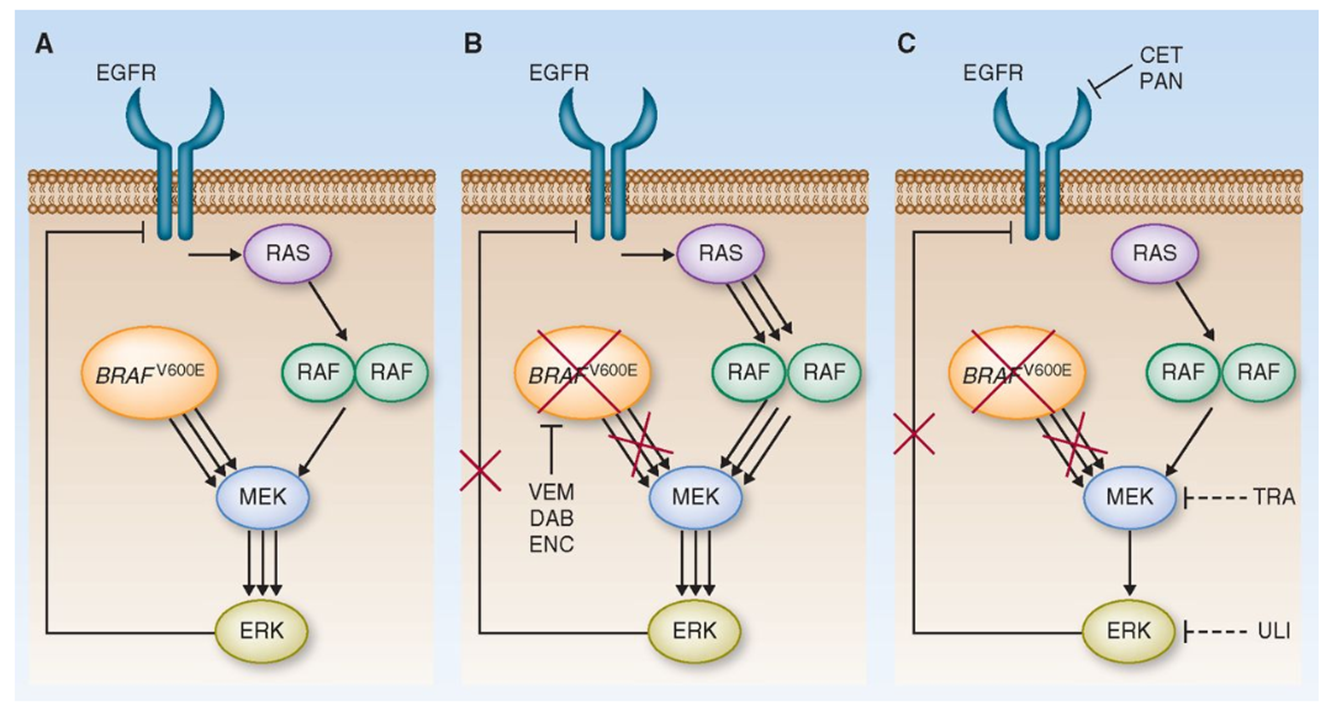 C: Therefore broader pathway blockade is needed, combining BRAF inhibition with EGFR and/or MEK/ERK inhibitors to suppress reactivation