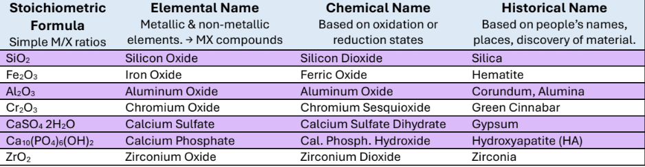 Historical names: Silica, Hematite, Corundum/ Alumina, Green Cinnabar, Gypsum, Hydroxyapatite (HA), Zirconia