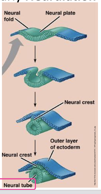 the process in early vertebrate development where the neural plate, a flat sheet of cells on the back of the embryo, folds to form the neural tube