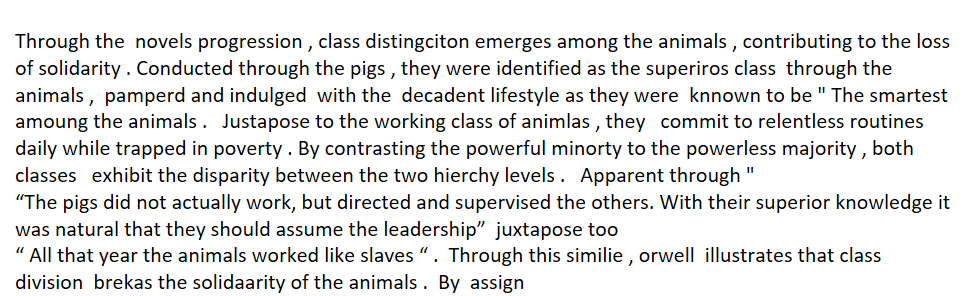 Through the novels progression , class distingciton emerges among the animals , contributing to the loss of solidarity . Conducted through the pigs , they were identified as the superiros class through the animals , pamperd and indulged with the decadent lifestyle as they were knnown to be " The smartest amoung the animals .  Justapose to the working class of animlas , they  commit to relentless routines daily while trapped in poverty . By contrasting the powerful minorty to the powerless majority , both classes  exhibit the disparity between the two hierchy levels .Â