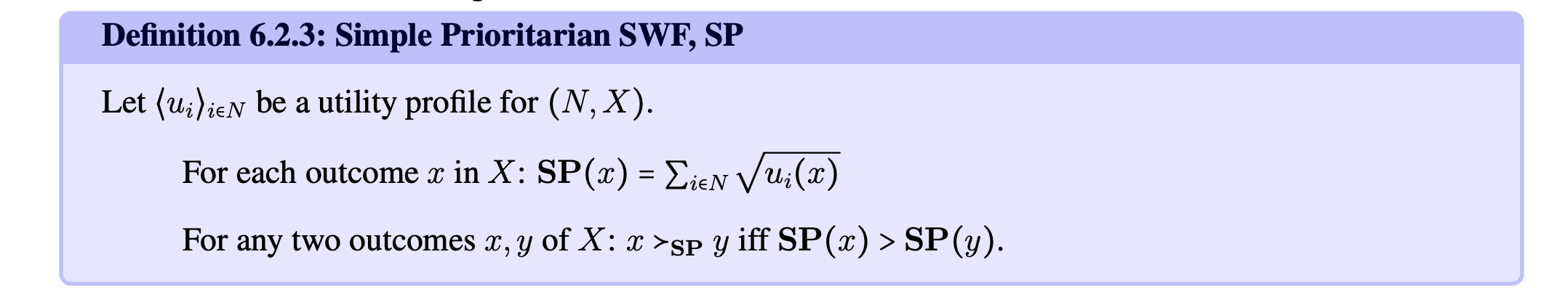 utility profile P=<ui>ieN for (N,X) & an outcome xeX. the social welfare of x given p is u(x)=sigma(sum) ieN ui(x)