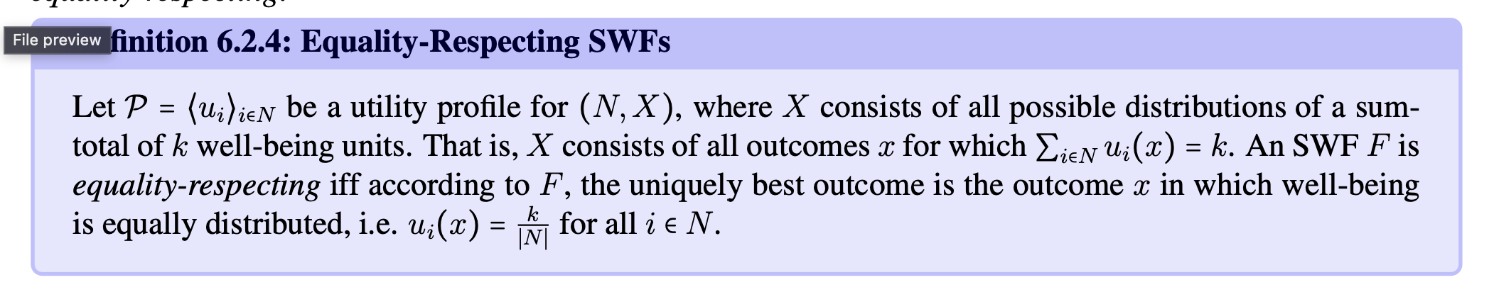 a SWF is equality respecting if it says that the best distribution if the one in which wellbeing is = distributed; every person gets a WB of k/n