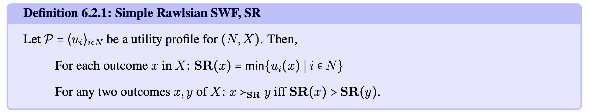 N= finite set of individuals, x = set of outcomes. P=<ui>ieN for (N,X) specifies a utility function u:x→R for each i of N