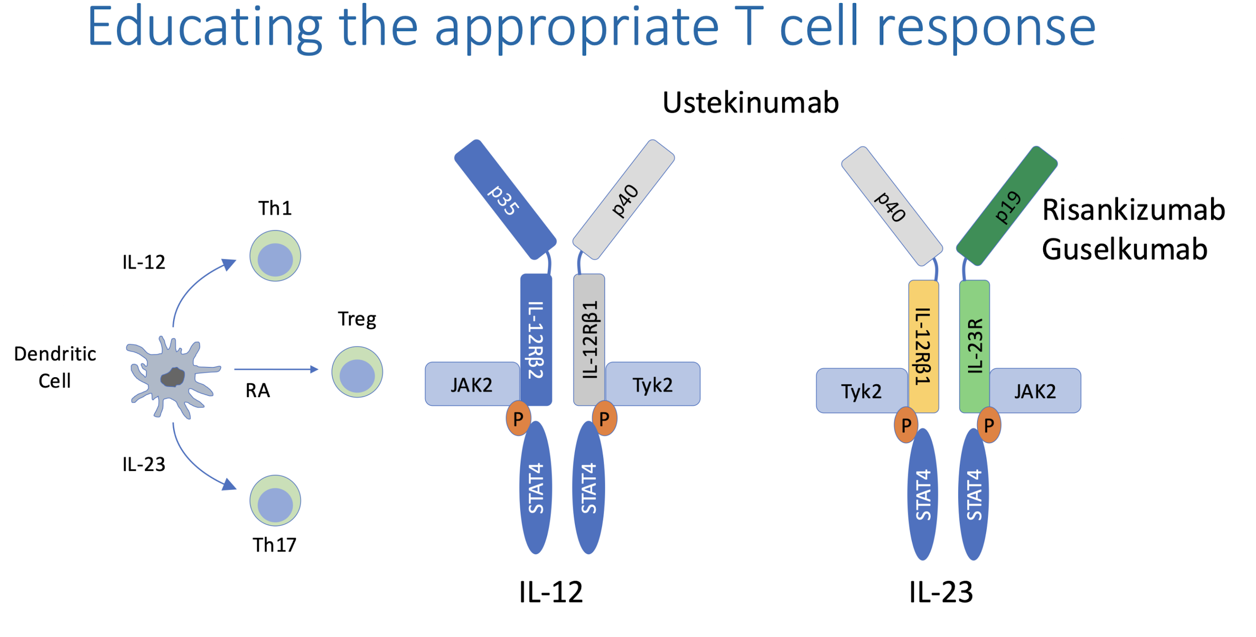 Antibodies blocking these pathways include Ustekinumab (IL-12) , Risankizumab, Guselkumab (IL-23)