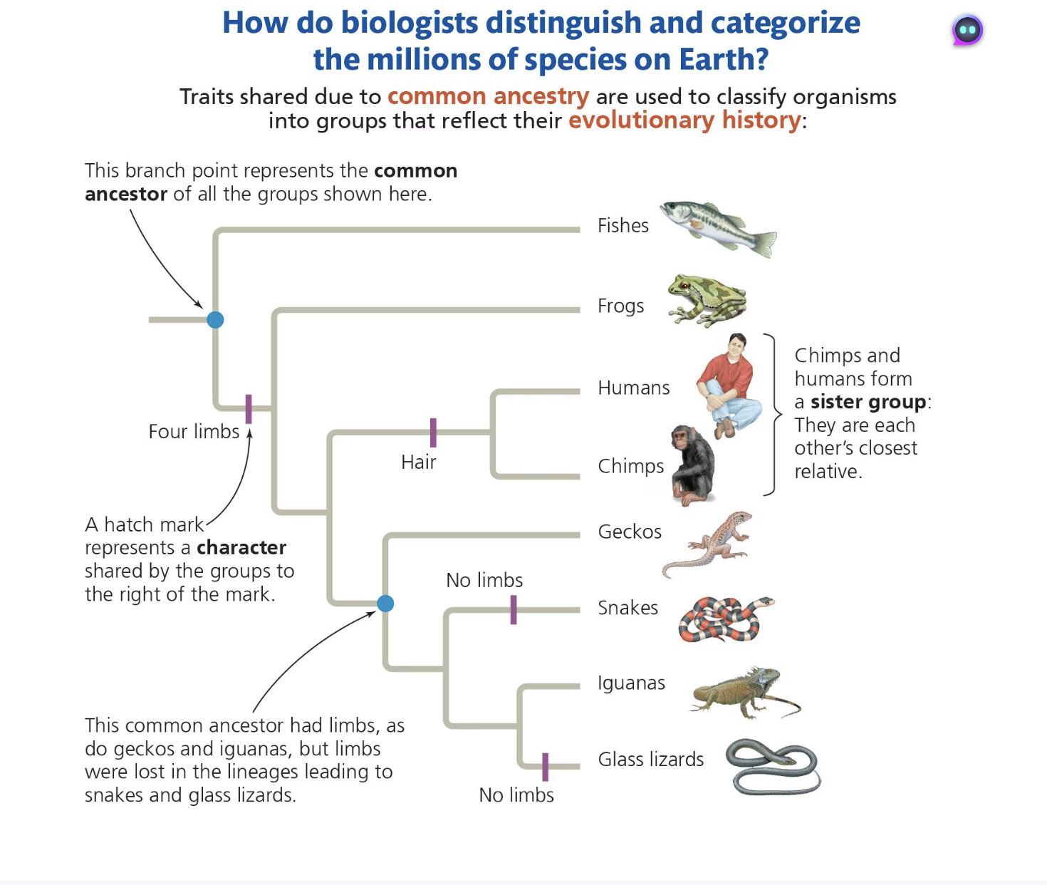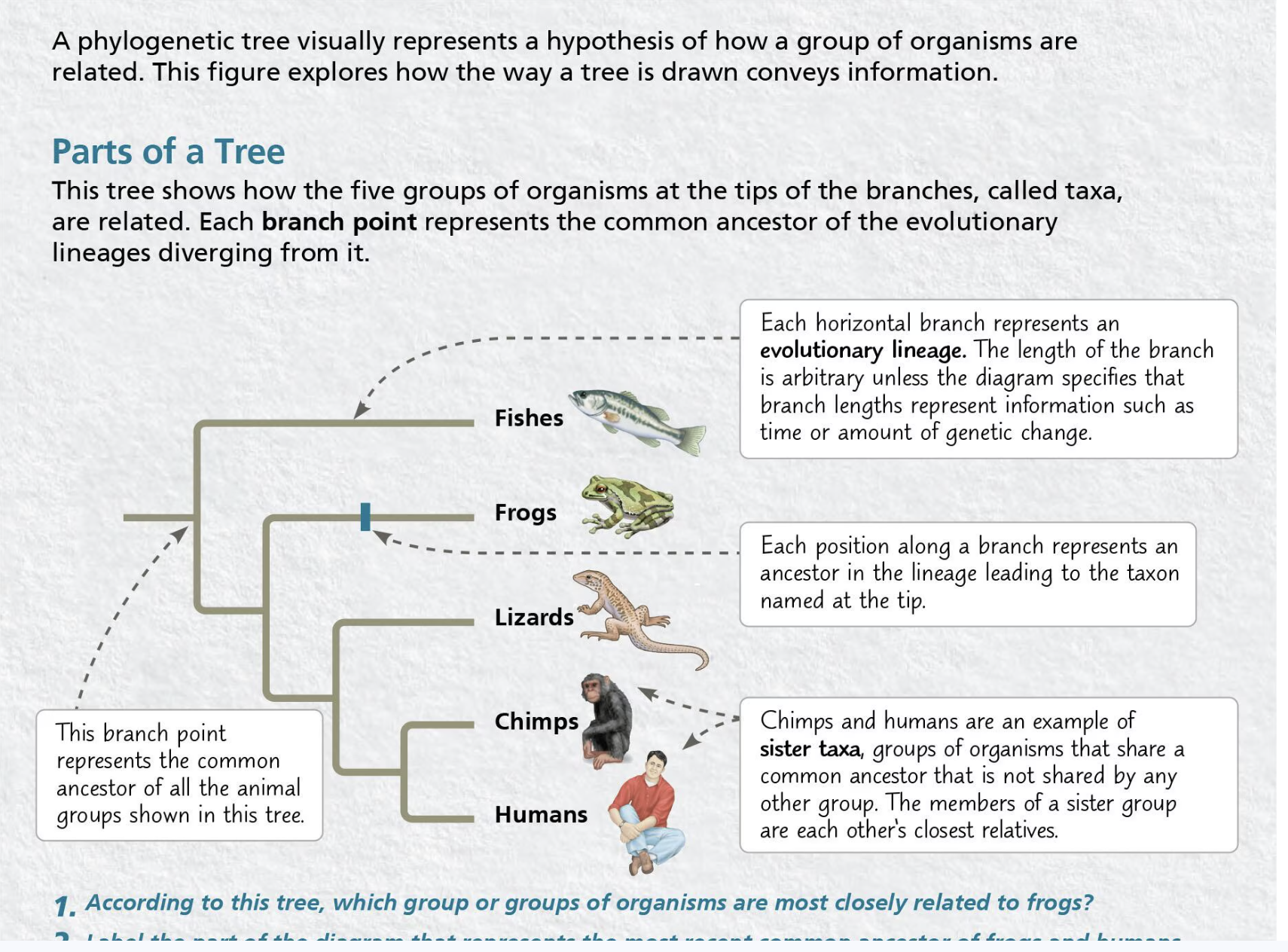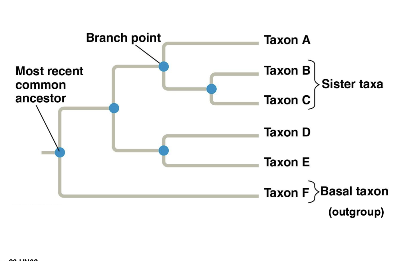 Take a look at what the 1. Branch point 2. evolutionary lineage 3. sister taxa 4. and ancestor looks like on a tree
