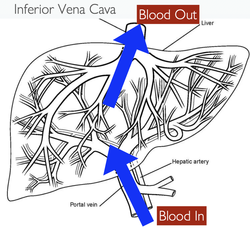 Portal vein (dominant) – brings 75–80% of blood to the liver