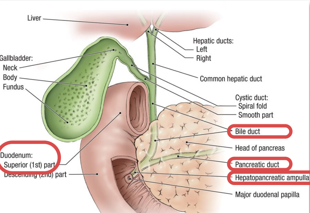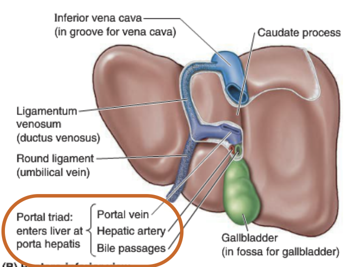 enter and exit at porta hepatis (deep, transverse fissure on the underside of the liver)