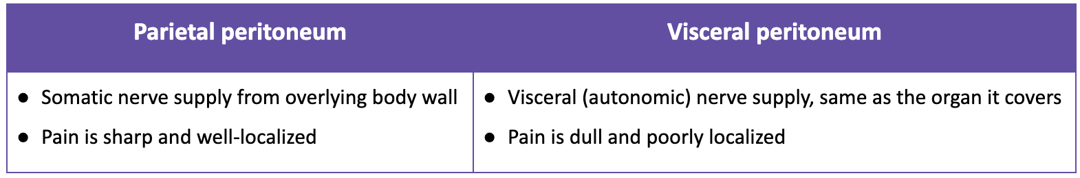 Parietal pain: Somatic nerves activated → sharp, localized pain at actual site