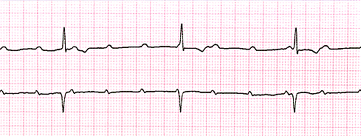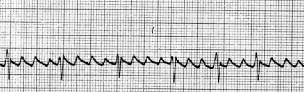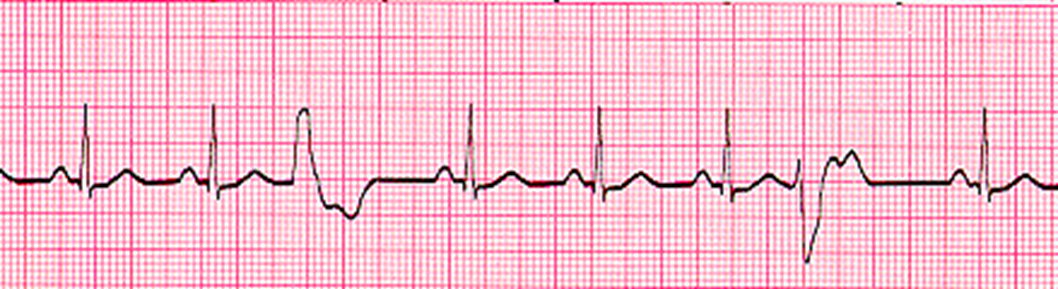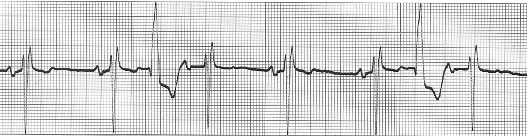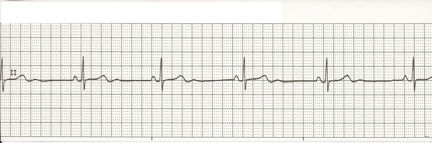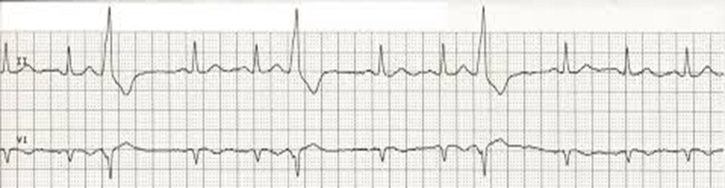 trigeminy (PVC occurs every third beat). rare. has QRS