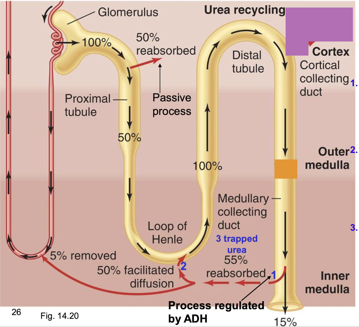 urea is trapped by the recycling process in the inner medulla because very little urea is removed by vasa recta