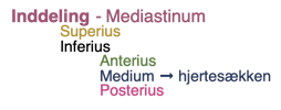 Mediastinum opdeles i mediastinum sup. og inf., hvor inferius opdeles i 3; ant., medius og post.