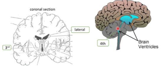 4 Ventricles in the middle of the brain: 2 lateral, a 3rd and a 4th ventricle