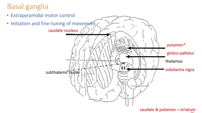 The caudate and the putamen make up the striatum —> dopaminergic neurons dark in colour so stripy