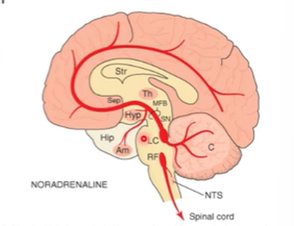 Nadr neurons originate from a single nucleus: locus coerelius (part of the reticular activating system – role in general arousal)