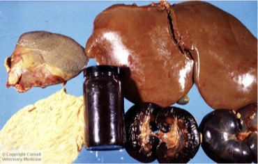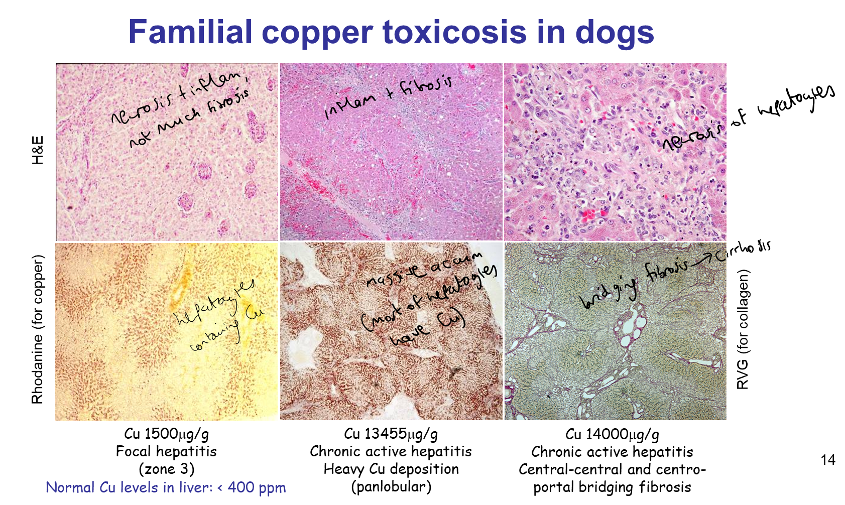 Copper toxicosis —> haemolytic crisis, acute chromoproteinaemic, nephrosis, liver degen, icterus
