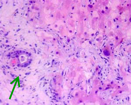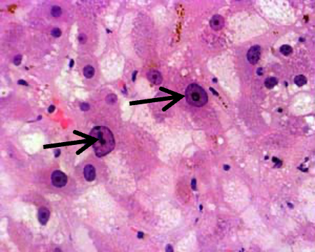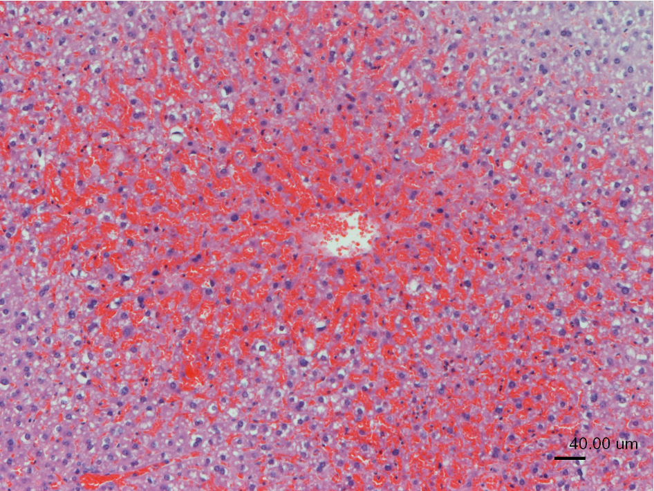 early stage —> degenerate/necrotic hepatocytes still orderly arranged
