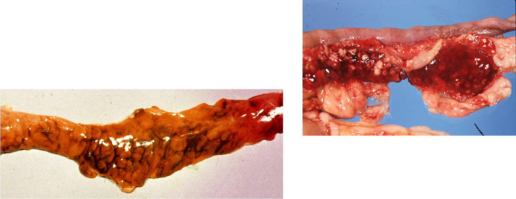 later stage —> dilated, blood-filled sinusoids due to loss of hepatocytes