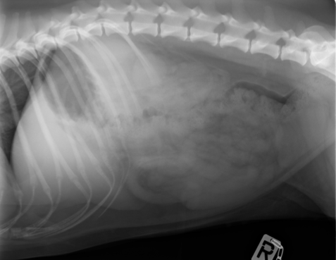 Necrosis of adjacent tissue (adjacent to stomach) = R image