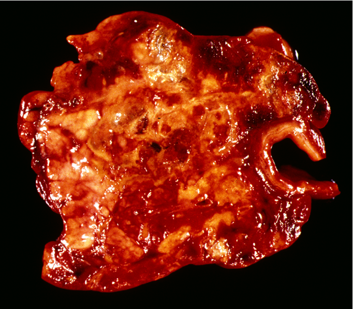 One-time massive necrosis with destruction of the reticular framework → fibrosis (repair)