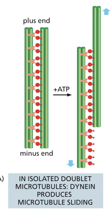 dynein walks along the adjacent microtubule doublets- and slides along them, converted to bending and produces the beating motion(also properly flagella forward)