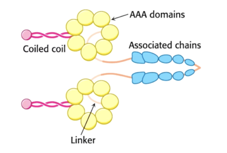 dyneins- 2 × 530kDa(heavy chain-ATPase), 2 × 74kDa(intermediate binds cargo), 2 × 53kDa(light intermediate), 6 × 16.5(light chains)