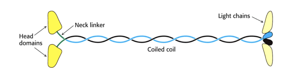 elongated protein with 2 globular head domains and bind microtubule and ATP