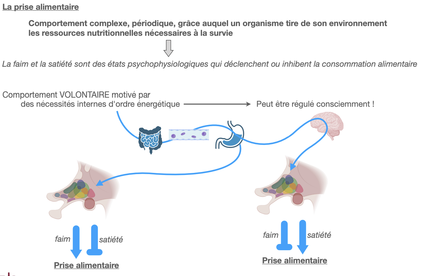 La prise alimentaire est un comportement complexe, périodique permettant d’obtenir les ressources nutritionnelles nécessaires à la survie ; elle est pilotée par les états de faim (déclenche) et de satiété (inhibe).
