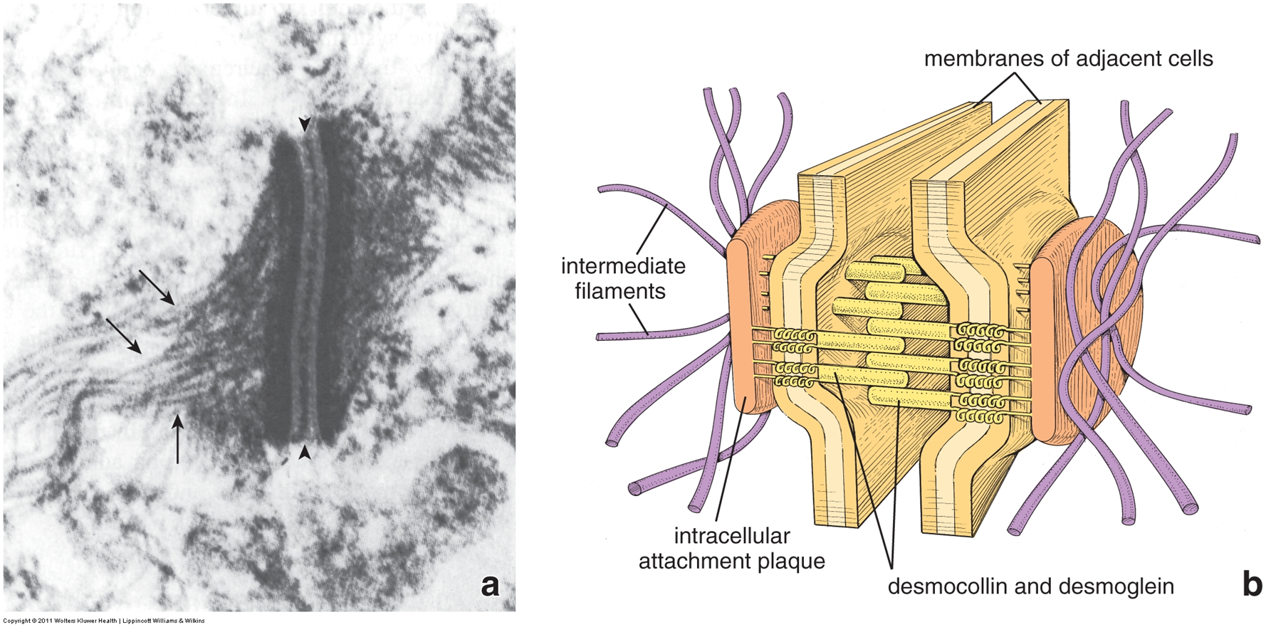 provide very strong cell-cell attachment by anchoring to intermediate filaments