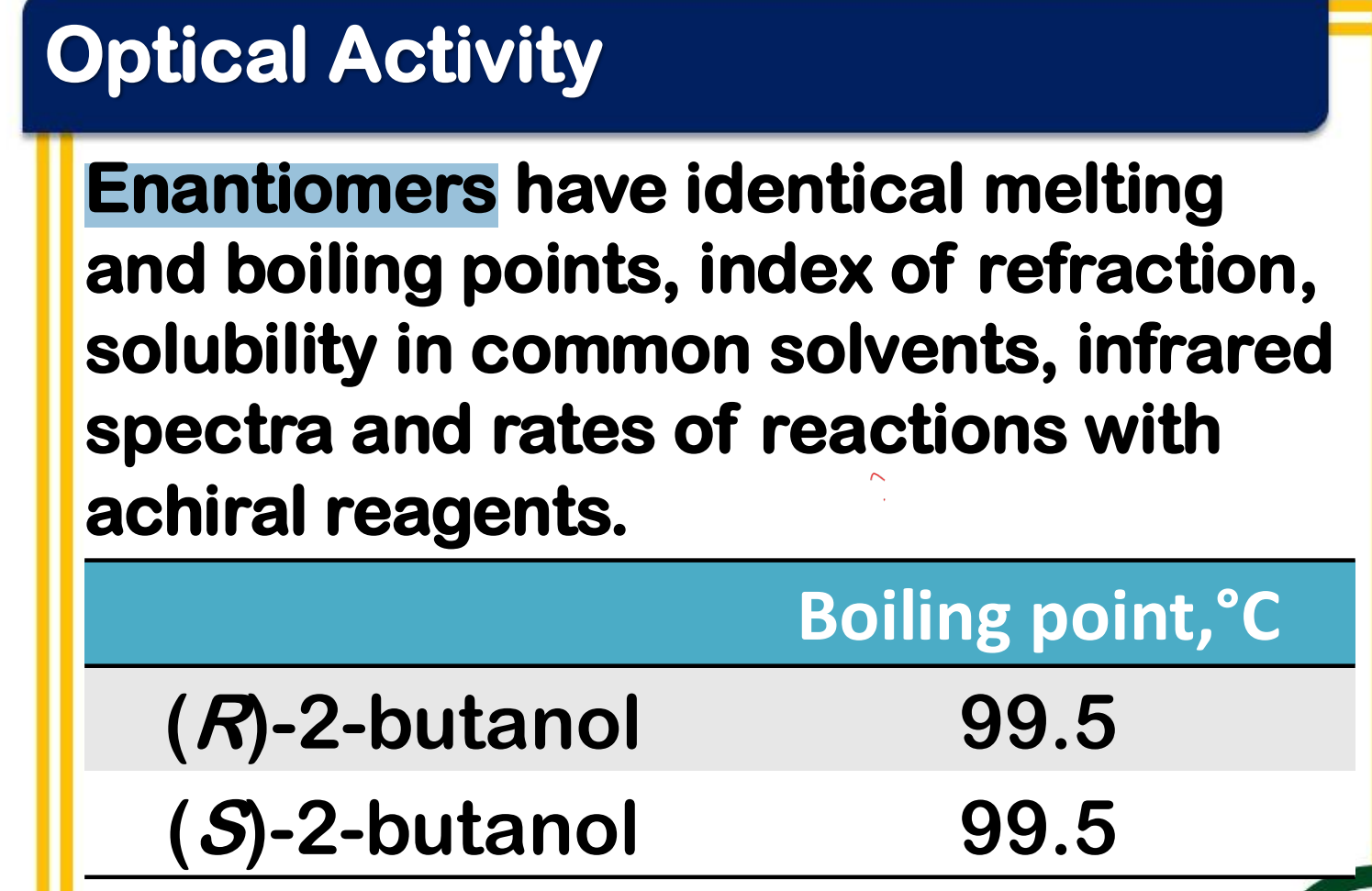 _______________ have identical melting and boiling points, index of refraction, solubility in common solvents, infrared spectra and rates of reactions with achiral reagents.