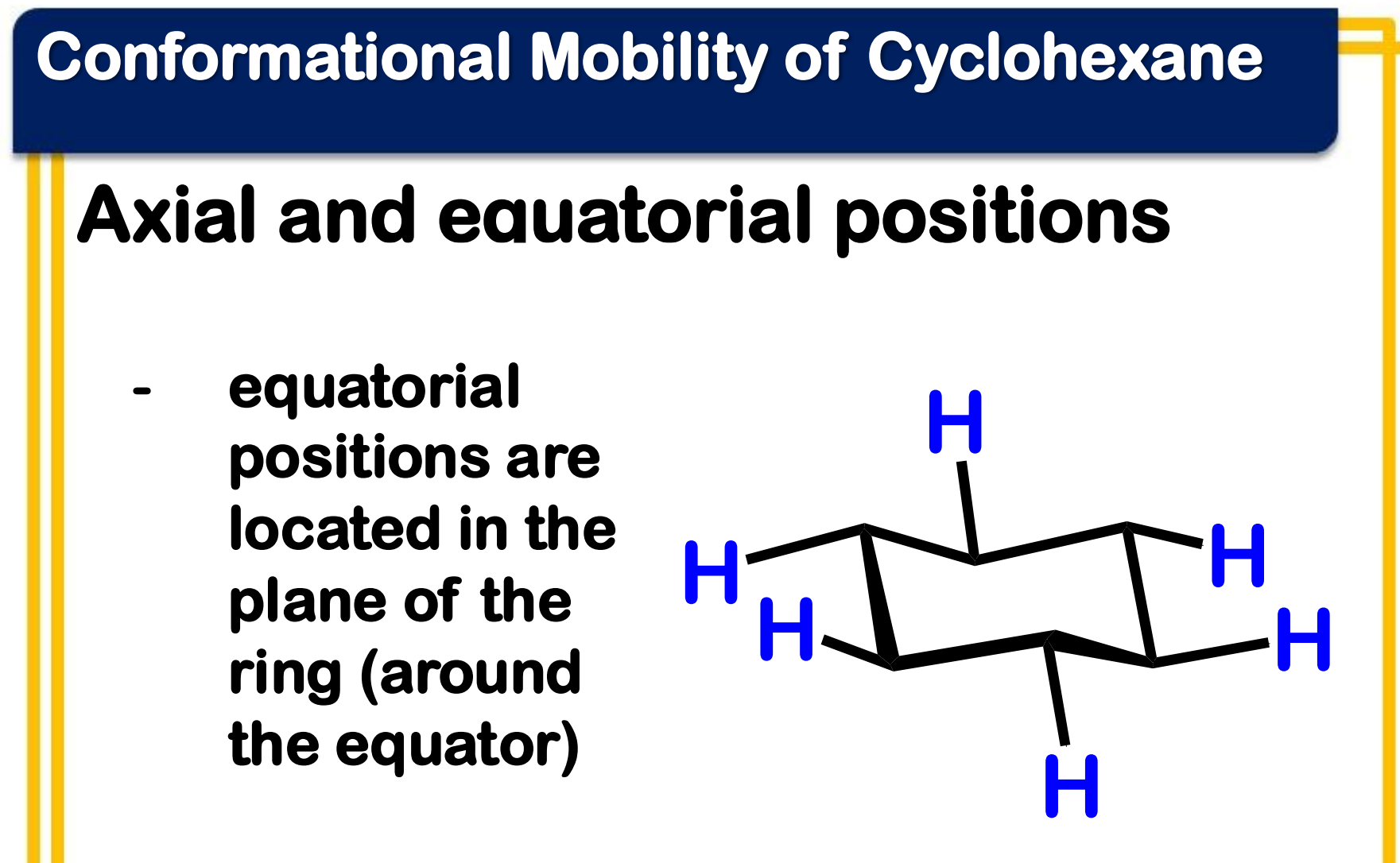 ______________ positions are located in the plane of the ring (around the equator)