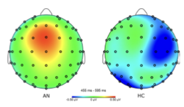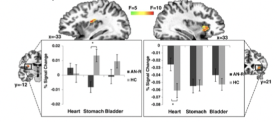 disturbance of interoceptive signal processing found at the level of cortical representation → difference in the way the brain is processing the heartbeats in AN patients