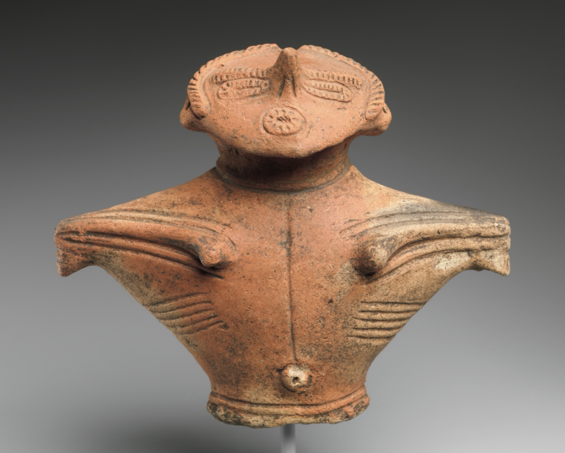 (Dogū (clay figurine), Final Jōmon period, ca. 1000–300 BCE, clay with cord-marked and incised decoration, 6 inches high (NY: The Met). Like most figurines found at Jōmon sites, this one is broken at the waist, perhaps deliberately