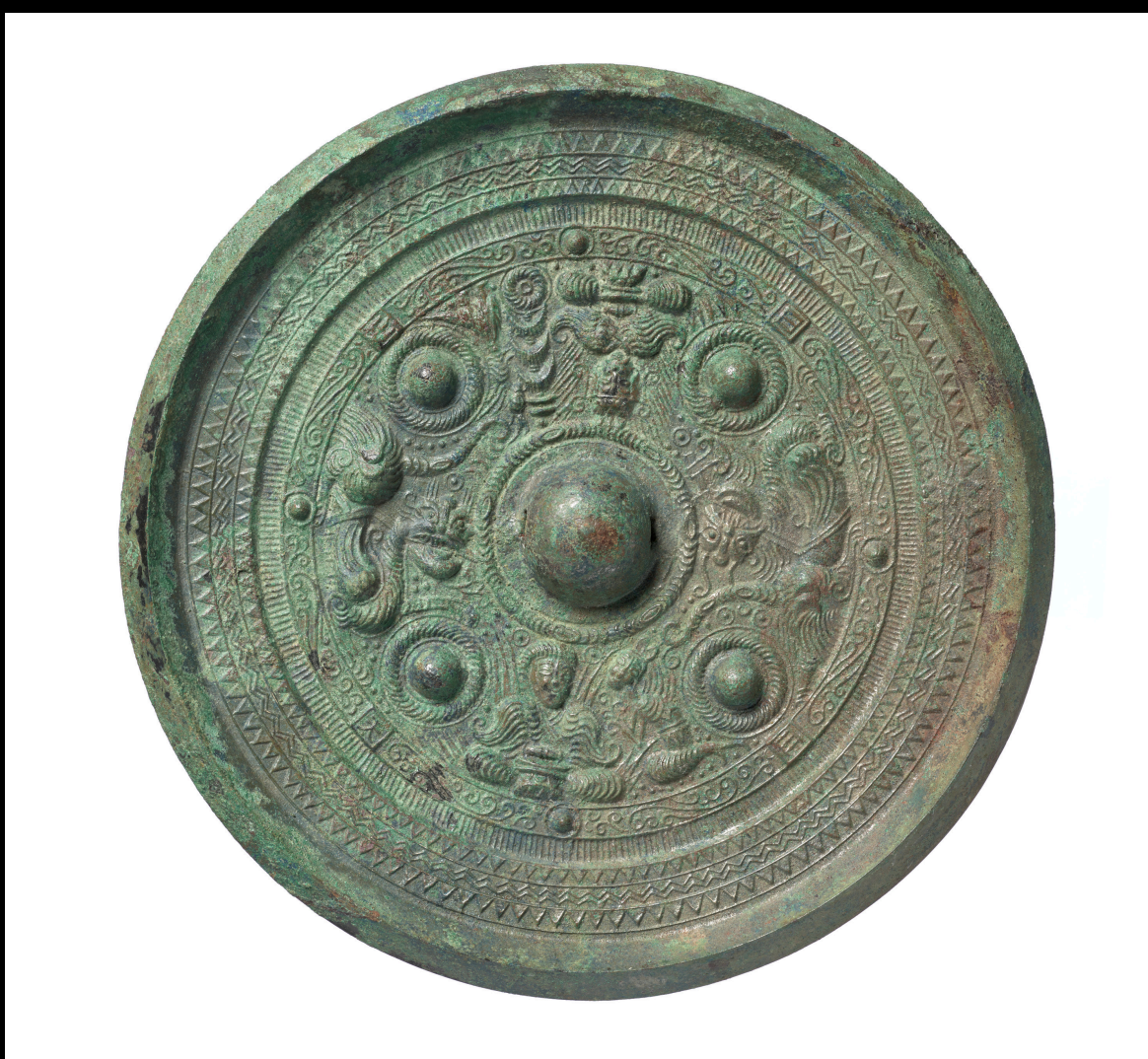 Kofun Mirror with triangular and arabesque patterned band, gods, and animals, ca. 400, bronze, diameter 21 cm (Kyoto National Museum).