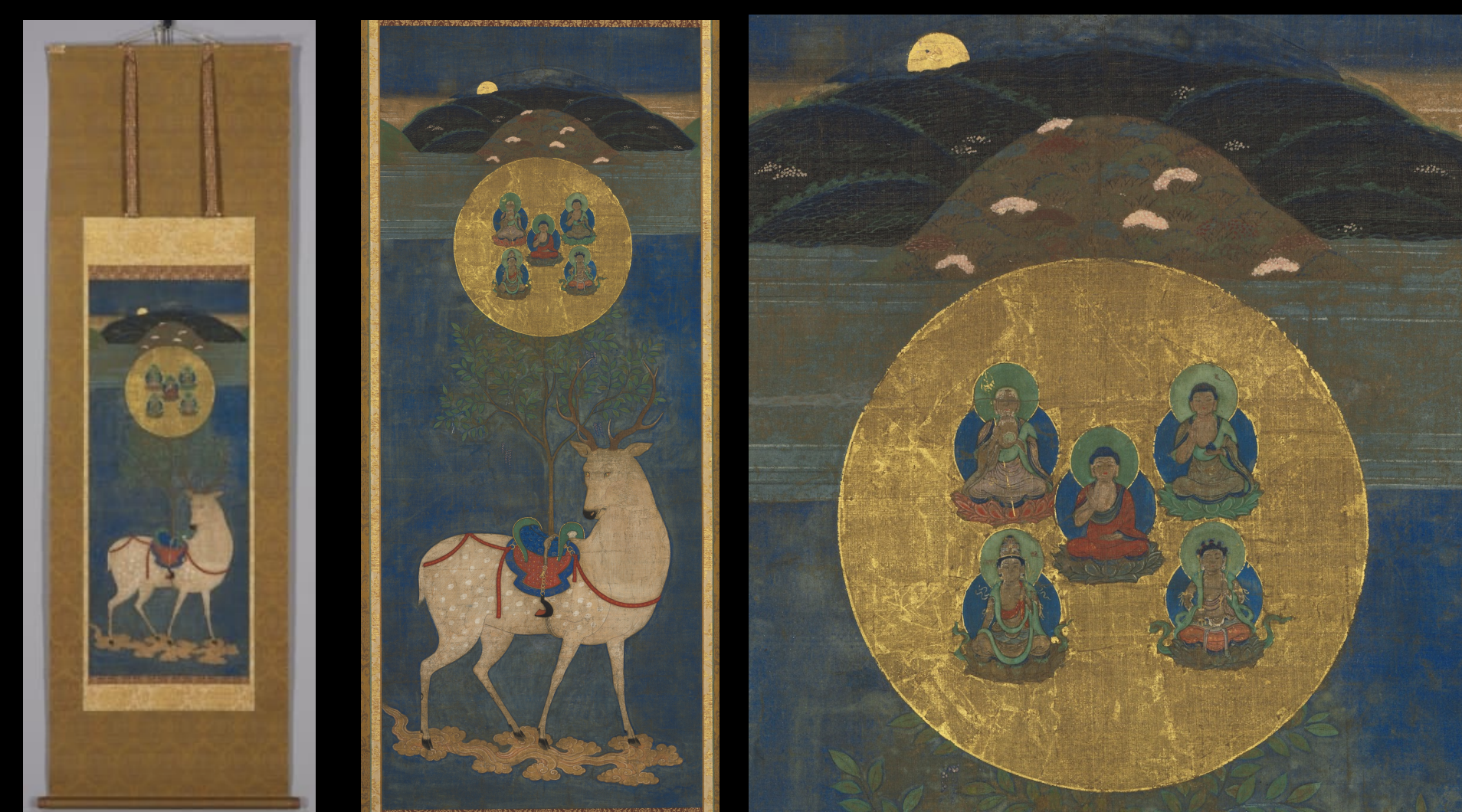 Kasuga Deer Mandala, mid-1300s–1400s, ink, color, and gold on silk, 38 × 16 inches (Cleveland Museum of Art). Legendary myths of the origins of the Japanese people (and the imperial line) sometimes include a mirror hanging from a tree. Other stories tell of Shinto deities arriving at the Kasuga shrine in Nara on the back of a sacred white deer. The Buddhist figures on the mirror point to the accommodation of Shinto and Buddhist practices in Japan.