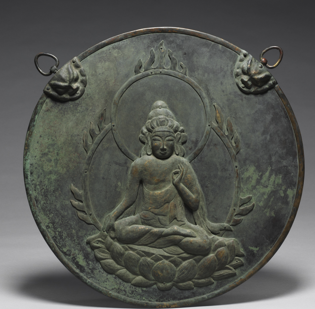 Votive plaque with Kannon, the bodhisattva of mercy and compassion, ca. 1360, bronze with repoussé and etching, 21 inches diameter (Cleveland Museum of Art).