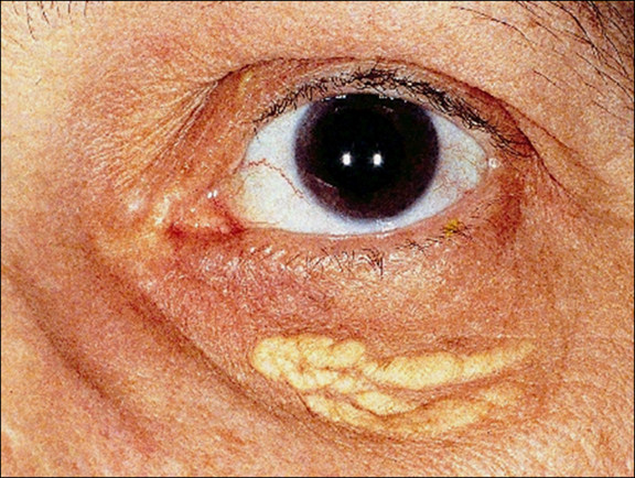 Lipid & cholesterol deposits (50% associated with elevated serum lipid levels)
