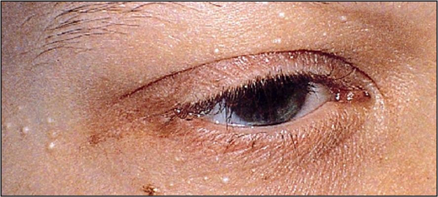 Change in lid contour/lash redirection or loss - lower lid is most common site