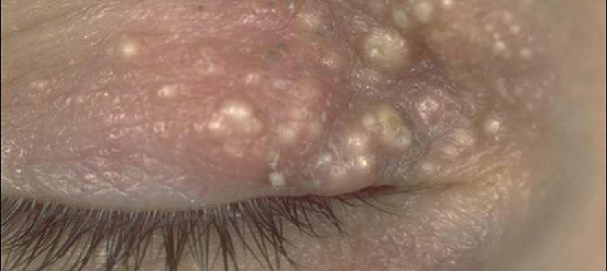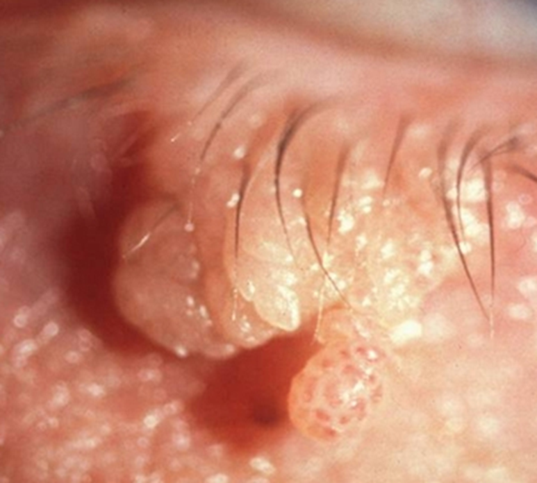 Cyst of Zeis - white cheesy (sebaceous) material - occurs on eyelid margin