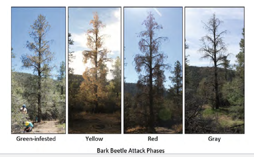 drought-stressed trees are more vulnerable to bark beetle outbreaks and fungal pathogens. This increased mortality adds to the over-abundance of forest fuels and increases the risk of severe wildfire