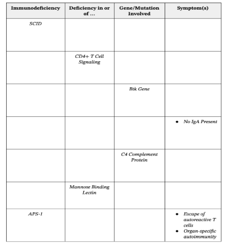Defect in MHC class I or II expression; leads to lack of CD4+ or CD8+ T cell activation: Bare Lymphocyte Syndrome | |