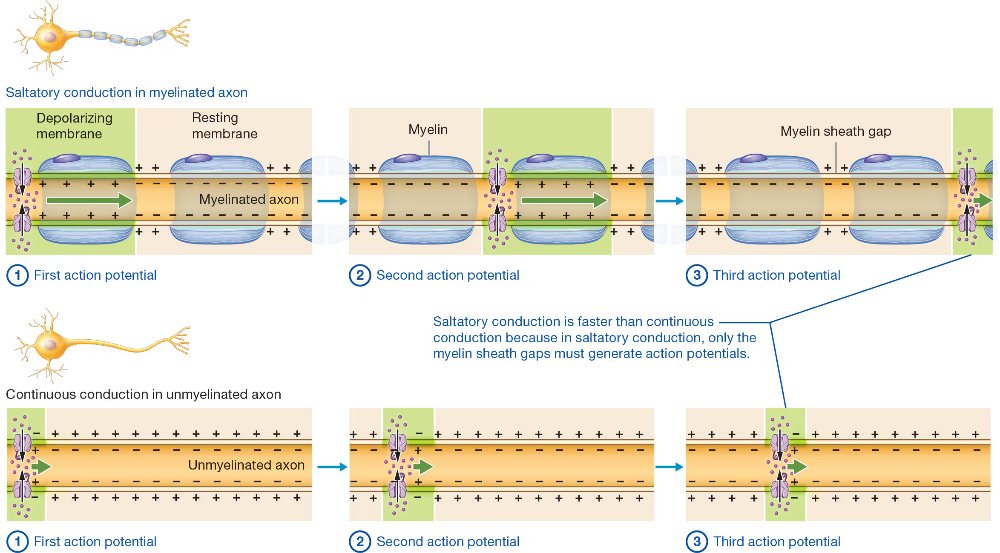 Big Idea: Saltatory conduction has a more faster and efficient propagation than continuous conduction because it has a myelinated axon and continuous conduction doesnât have an axon