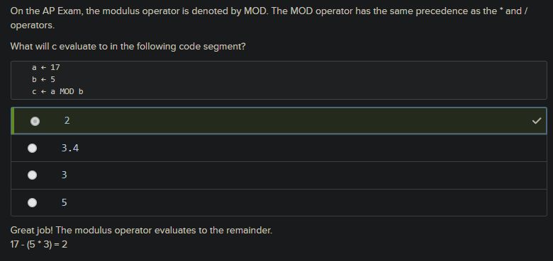 On the AP Exam, the modulus operator is denoted by MOD. The MOD operator has the same precedence as the * and / operators.