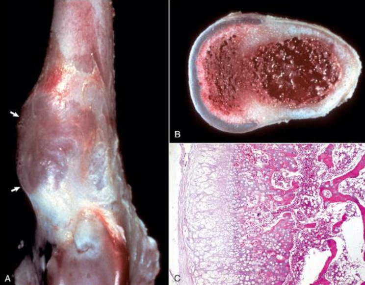 adjacent to physes in young dogs and horses (mass usually stops growing when animal reaches skeletal maturity)