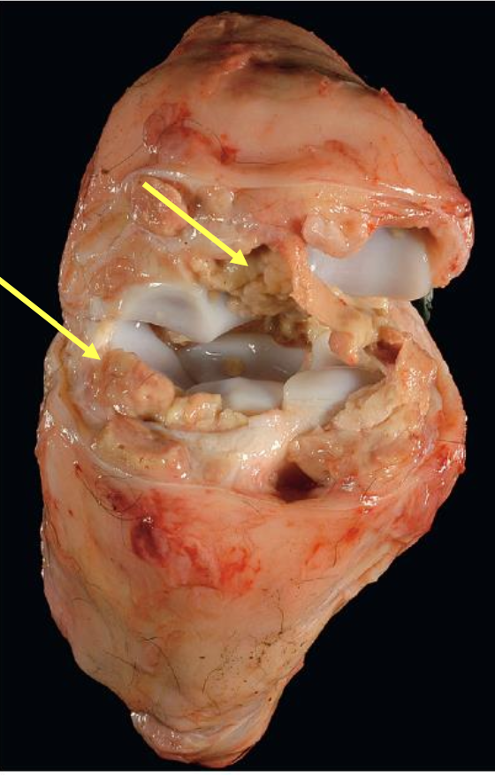 What is affecting this carpus of a calf? note the abundant yellow fibrin within the joint and the white glistening articular cartilage.